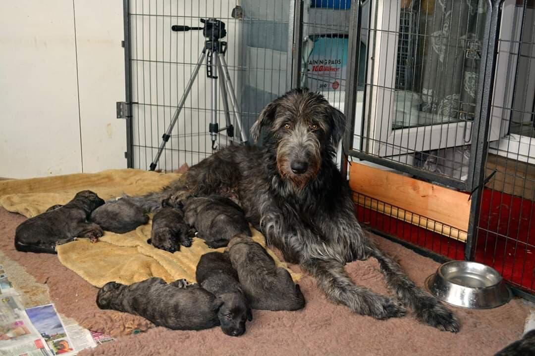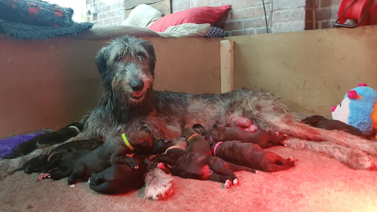 Raising Irish Wolfhounds puppies is immensely hard work. Pups are 1-2lb when born and mum can weigh as much as 140+ lbs (10 stone). Mum can unintentionally injure or kill a puppy or the entire litter very quickly so they require 24 hour supervision. We do not leave them for a second within the first 4 to 5 weeks, after this they still need supervision when mum is with them as a broken leg is far more serious to a Giant Breed than it is to smaller breeds