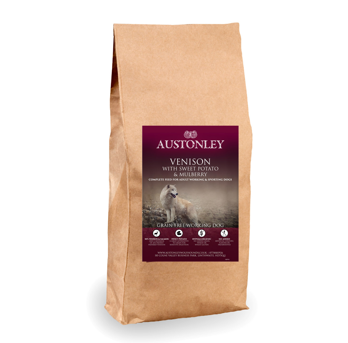 Venison & Salmon 50% (including 26% Freshly Prepared Venison, 19% Dried Salmon, 2.5% Salmon Oil & 2.5% Salmon Stock), Sweet Potato (27%), Potato (7%), Peas, Pea Protein, Linseed, Beet Pulp, Omega 3 Supplement, Vitamins & Minerals, Vegetable Stock, Mulberry (equivalent to 7.5g per Kg of product), FOS (92 mg/kg), MOS (23 mg/kg).